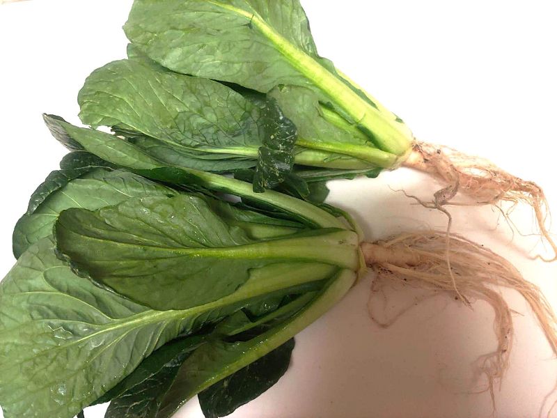 収穫!葉も肉厚でしっかりとした株。根まできれいな小松菜です。