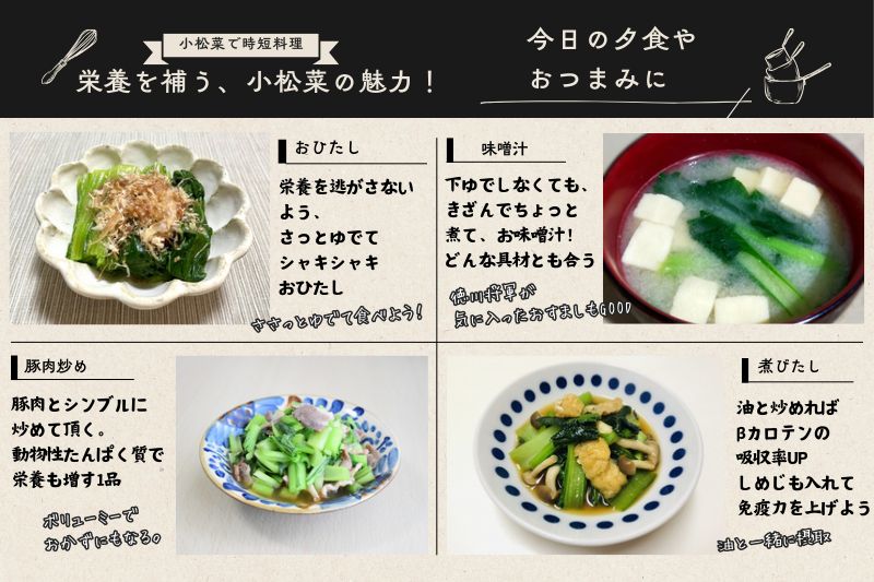 あくが少ない小松菜は、下茹でも不要なので時短レシピにぴったりな最高野菜です。