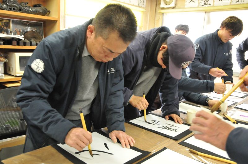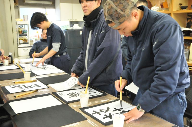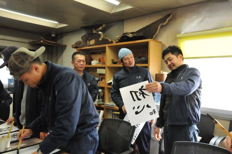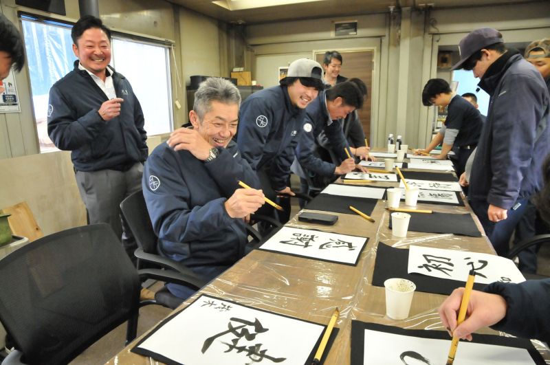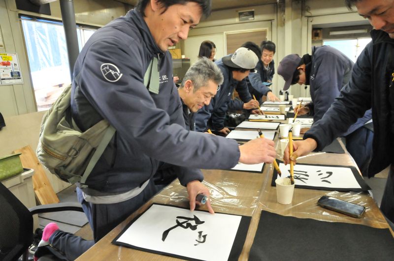 新年早々大工だらけ!!!しかもみんなで書初め!!という雰囲気がまた、その場を面白くさせちゃうわけでして、一人書き上げると笑いが起きたり、「お~!」となったり、漢字が思い出せなくて筆が止まったり。それでも書いている時は各々が真剣になってしまいます。一発勝負で完成の人も多いので短い時間なのですが、和やかです。