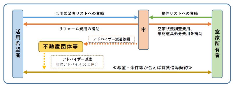 空き家を所有している人と活用のため空き家を探している人が情報を登録しておくことで、双方の希望する条件に適合する物件がみつかるというものです。マッチングした双方が活用を希望すると、必要に応じて契約に係る相談などができる専門団体の相談員を案内してもらえます。