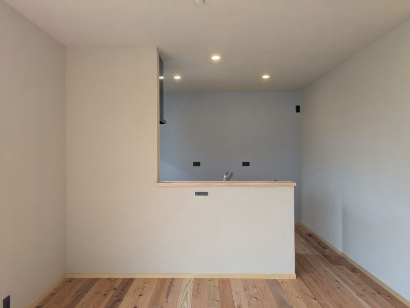 ▼リビングは珪藻土の壁。キッチン方向の壁をブルーのアクセントカラーにして、爽やかさと立体感を演出。