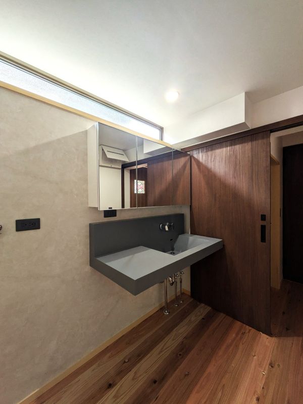 ▼脱衣所にも光を入れる工夫。無垢材の床が足元の快適さを保つ。