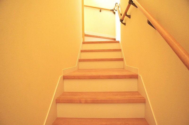 ▼ご家族のことを考えた緩やかな階段。踊り場が設けられた階段は、のびやかに2階へと続きます。