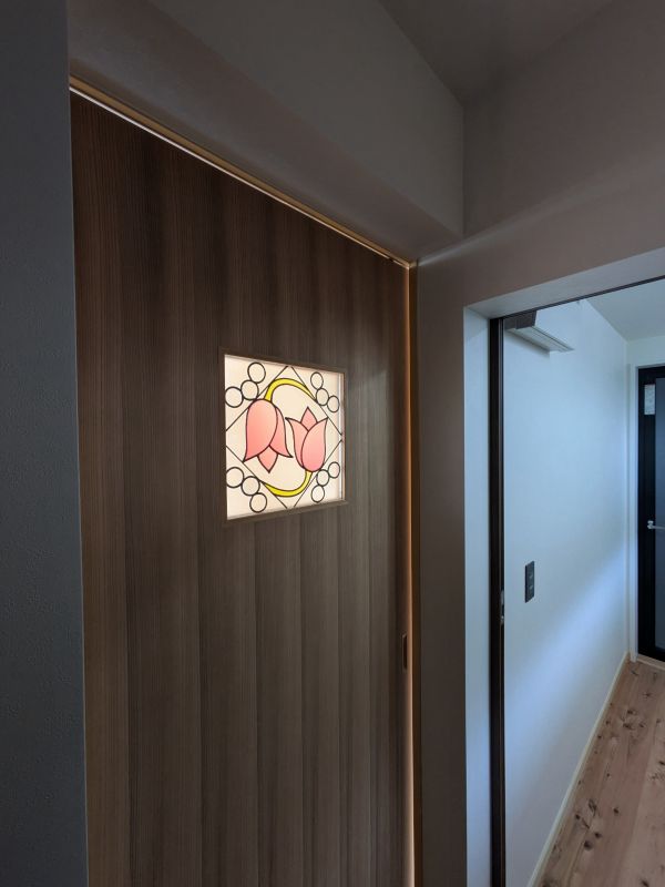 ▼オーダーの造作建具に取り付けたステンドグラス窓からも光が通ってきます。